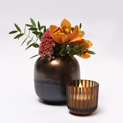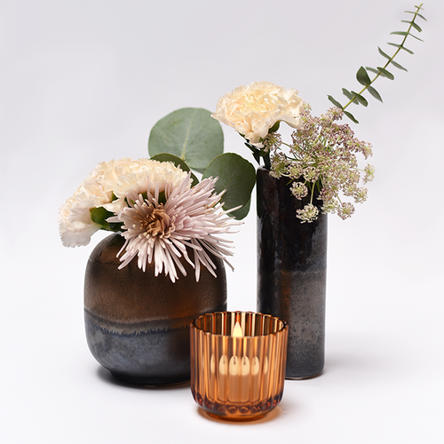 Mit ihren unterschiedlichen Braun- und Bernsteintönen verströmen die Arrangements eine warme und behagliche Atmosphäre, die sich jedoch auch perfekt in glanzvolle und elegante Räume einfügt. Die Auswahl der Blütenfarben verleiht den Kompositionen eine zurückhaltend natürliche oder glamouröse Erscheinung. Hochwertige LED-Kerzen werden in die Teelichthalter eingesetzt, wobei das Licht auf faszinierende Weise in den verschiedenen glänzenden Oberflächenstrukturen der Gefäße reflektiert wird.