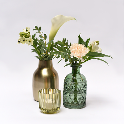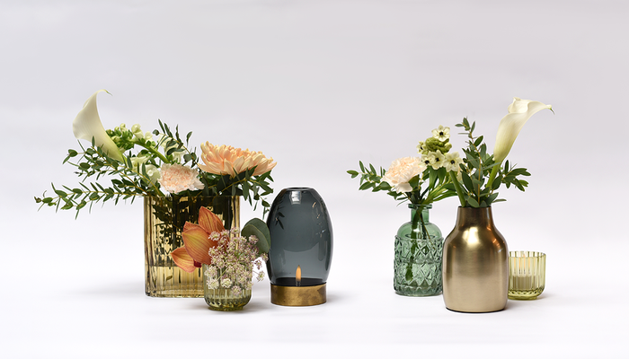 Abhängig von der Auswahl der Blumen und der Umgebung erzeugen die verschiedenen Grüntöne mal eine zurückhaltend natürliche Wirkung oder strahlen in sattem Glanz und Glamour. Durch die Kombination mit metallisch glänzenden Oberflächen entsteht entweder ein kühler oder eleganter Eindruck. Die Teelichthalter sind mit hochwertigen LED-Kerzen ausgestattet, deren Licht faszinierend in den unterschiedlichen glänzenden Oberflächenstrukturen der Gefäße reflektiert wird.
