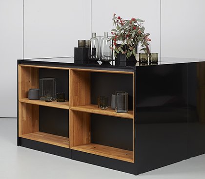 Schwarzes Blockbuffet mit integrierten Regalkästen in Eiche