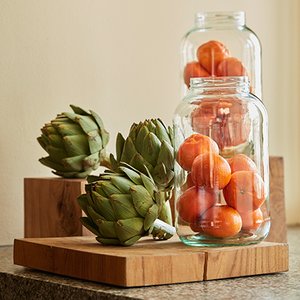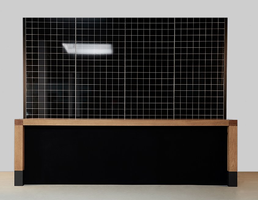 Buffet mit schwarzer Front und einer Auflage aus Holzbohlen