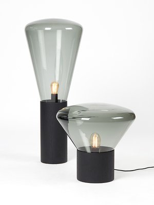 Nicht nur die besonders großen Ausmaße von 107 Zentimetern, auch die feinsinnige Kombination aus Formen und Materialien machen diese handgefertigte Designerleuchte so reizvoll. Der massive Glasschirm wird von erfahrenen Glasmeistern der tschechischen Glasmanufaktur Janstejn im traditionellen Verfahren geformt und mundgeblasen. Die Kombination aus Massivholz-Sockel und dickwandigem Bleikristallglas schafft eine natürliche Anmutung.