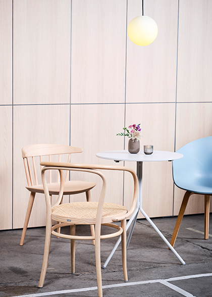 Der 209 Bugholzstuhl der Gebrüder Thonet, ein klassischer Caféhaus-Stuhl mit Armlehnen. Der Designklassiker wird aus massivem Buchenholz mithilfe von Wasserdampf gebogen und besteht - wie sein Vorgänger, dem 214 Stuhl - aus sechs Teilen.
