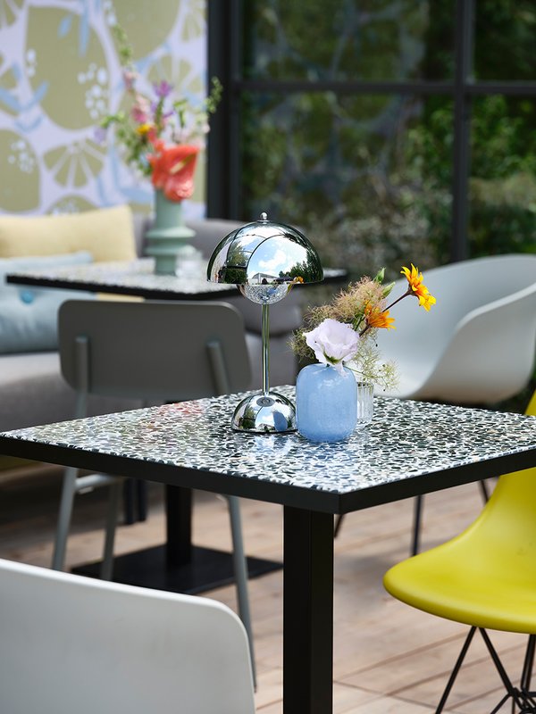 Dieser exklusive Terrazzo-Tisch präsentiert sich in wunderschönen Grüntönen und einem eleganten schwarzen Sockel. Dieses hochwertige Stück ist nicht nur ein visuelles Highlight, sondern verleiht Ihrem Event einen ganz besonderen Café- oder Restaurant-Charakter. Die Tischplatte ist in einen pulverbeschichteten schwarzen Stahlrahmen eingelegt und harmoniert perfekt mit anderen Materialien. Erleben Sie zeitlose Eleganz und Qualität in einem Möbelstück.