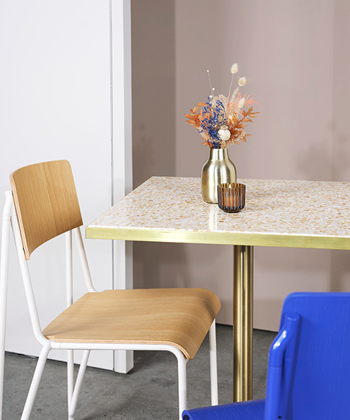Dieser exklusive Terrazzo-Tisch präsentiert sich in wunderschönen Rosatönen und einem eleganten schwarzen Sockel. Dieses hochwertige Stück ist nicht nur ein visuelles Highlight, sondern verleiht Ihrem Event einen ganz besonderen Café- oder Restaurant-Charakter. Die Tischplatte ist in einen goldenen Rahmen eingelegt und harmoniert perfekt mit anderen Materialien. Erleben Sie zeitlose Eleganz und Qualität in einem Möbelstück.