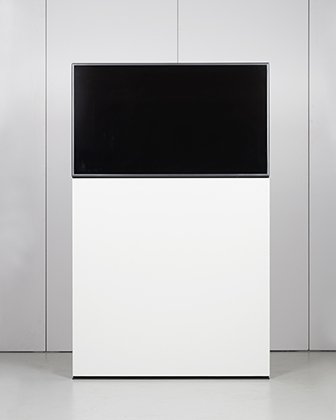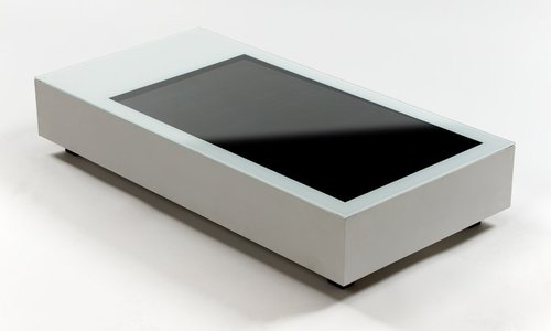 Von uns produzierter Lounge-Couchtisch mit eingebautem 40''-HD-Monitor, Glasabdeckung und schwarzen Füßen, exkl. Zuspieler