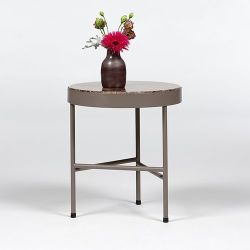 Der Beistelltisch von ferm LIVING kombiniert eine massive Marmortischplatte mit einem modernen Untergestell aus pulverbeschichtetem Metall.