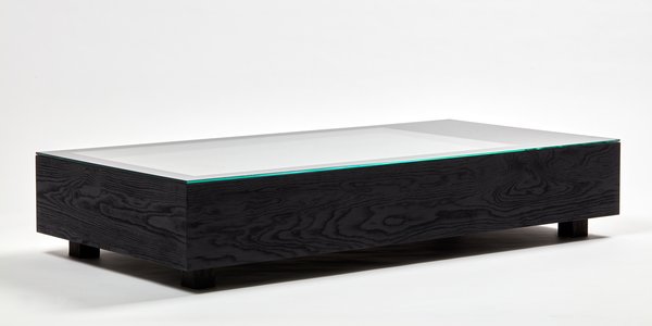 Von uns produzierter Lounge-Couchtisch mit eingebautem 40''-HD-Monitor, Glasabdeckung und schwarzen Füßen, exkl. Zuspieler