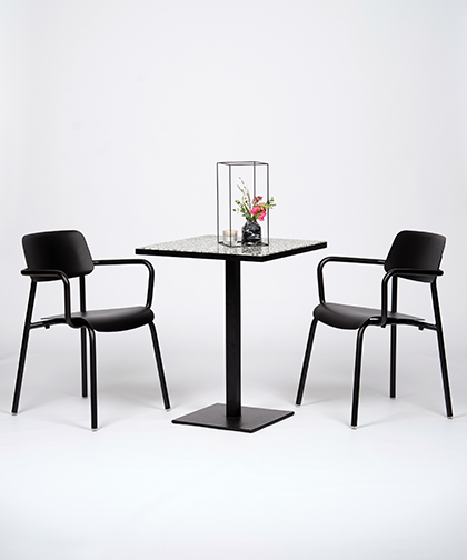 Dieser exklusive Terrazzo-Tisch präsentiert sich in wunderschönen Grüntönen und einem eleganten schwarzen Sockel. Dieses hochwertige Stück ist nicht nur ein visuelles Highlight, sondern verleiht Ihrem Event einen ganz besonderen Café- oder Restaurant-Charakter. Die Tischplatte ist in einen pulverbeschichteten schwarzen Stahlrahmen eingelegt und harmoniert perfekt mit anderen Materialien. Erleben Sie zeitlose Eleganz und Qualität in einem Möbelstück.